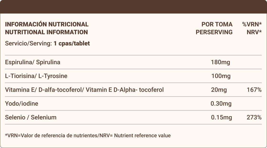 Ingredientes: Espirulina, L-tirosina, Selênio (Selenito sódico) e Vitamina E (Acetato de tocoferol) yodo (Yoduro potásico), anti aglomerante, estearato de magnésio e cápsula (celulosa).